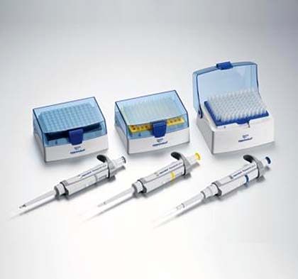 Kit of three adjustable volume pipettes and tips in sterile rack